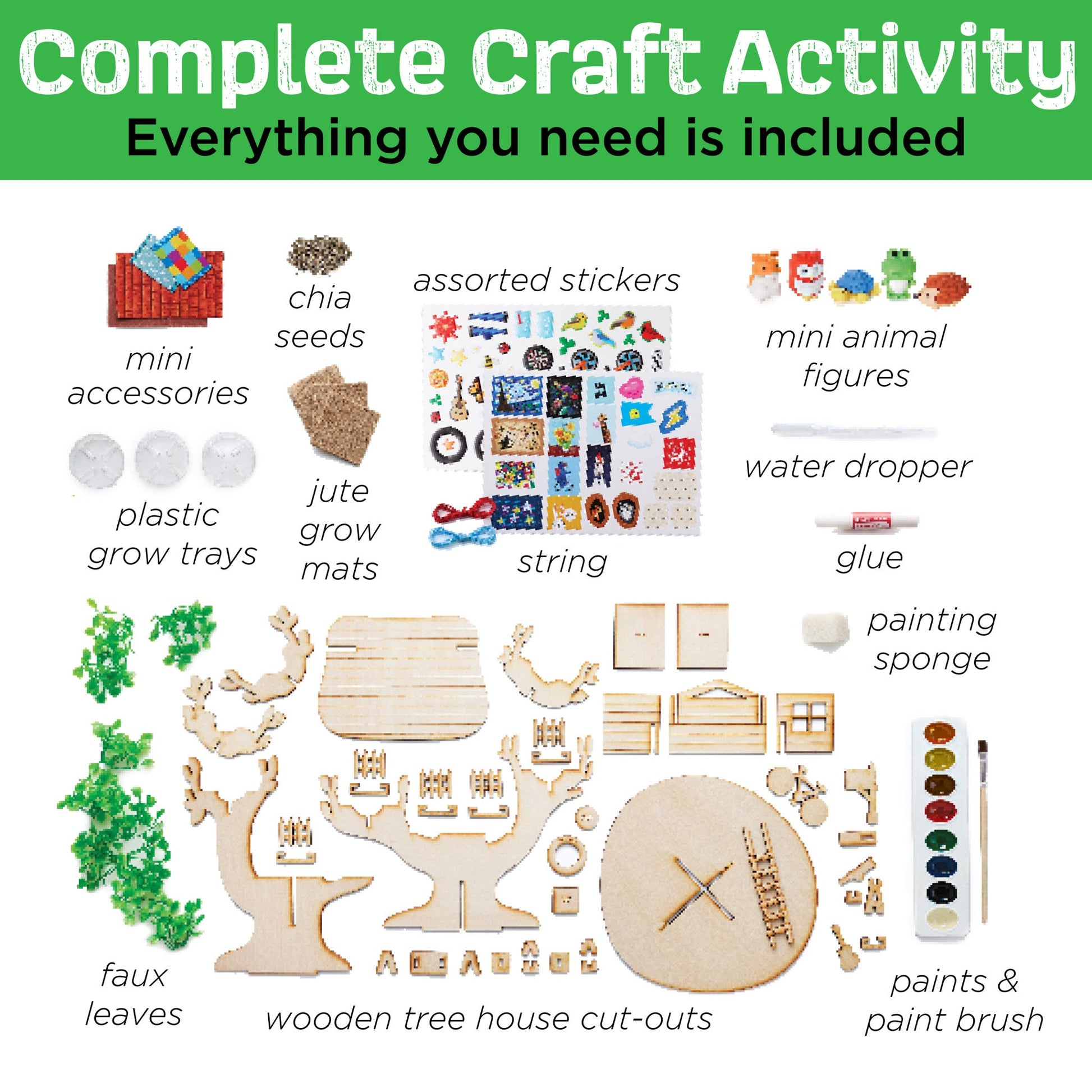 Craft kit for kids comes with wooden tree house cut-outs, chia seeds, miniature animal figures, assorted stickers, cardstock cut-outs, jute grow mats, plastic grow trays, water dropper, faux leaves, 2-sided adhesive dots, paint brush, small painting sponge, craft glue, string and sandpaper.
