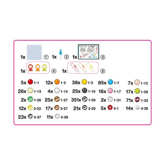 700 Beads in 22 colors (15x Classic, 3x Polygon, 4x Star), 1x Layout Tray, 1x Sprayer, 3x Keychain Attachment, 3x Color Strap, 1x Template Sheet (4 kinds), 1x Manual