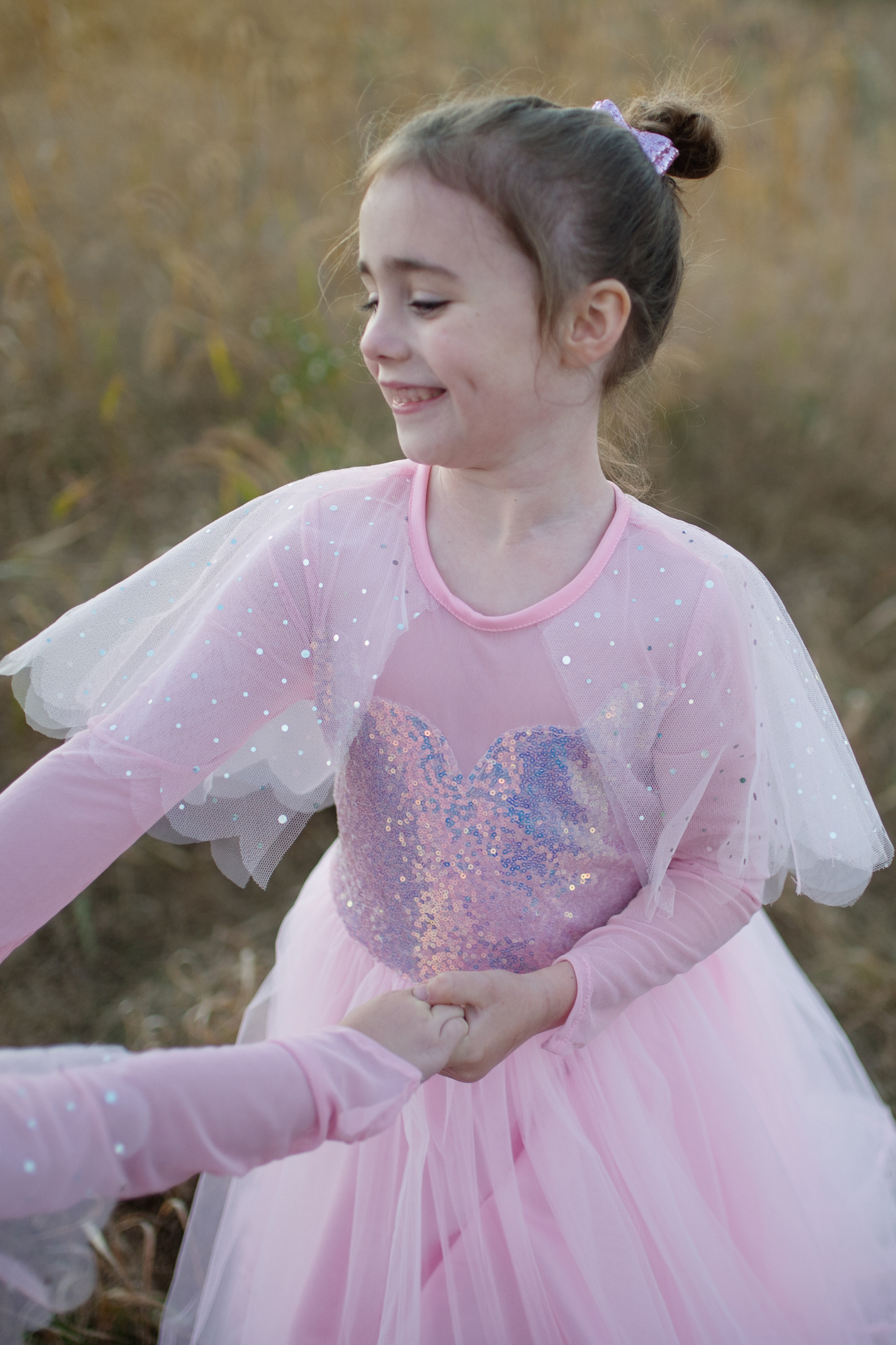 Elegant in Pink Princess Dress is a stunning design with a gorgeous sequinned bodice and illusion neckline (sweetheart neckline which is finished up to the neck with sheer and stretchy knit fabric) and satin trim. Attached to the neckline is a lovely sparkly capelet with scalloped finish, it’s made with pink mesh fabric showcasing printed holographic sequins. Elegant long sleeves are finished to a point. The skirt has a nice rich gathering of pink tulle finished with a ruffle made with the same holographic print as the capelet. The back of this dress has a Velcro closure and the elasticized waistband with a smocked waist (extra fabric gathering) provides even more comfort and size flexibility. Machine washable! This glamorous dress is sure to become your little one’s favourite childhood play costume!