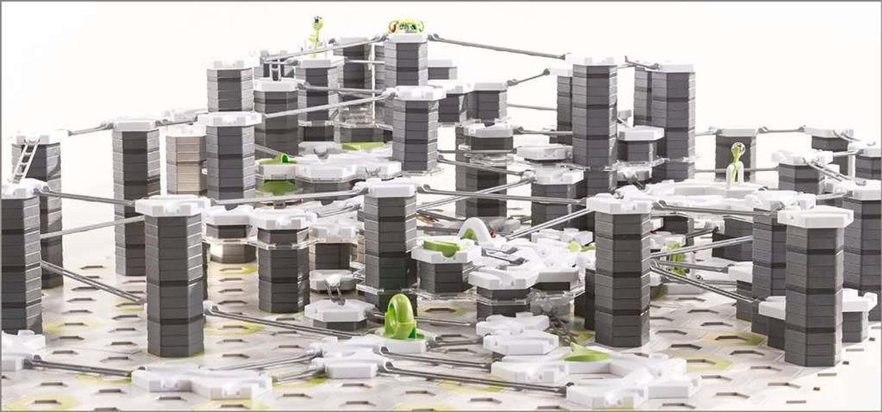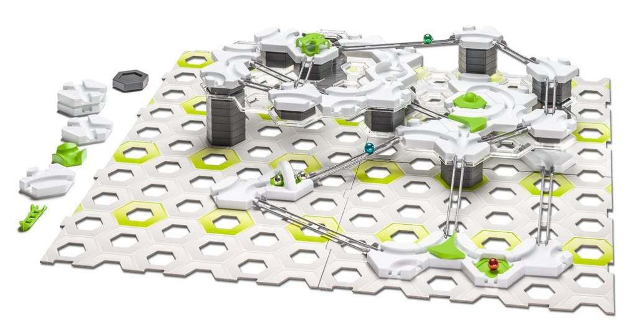 Contents: Instructions (D, F, EN, NL, E), construction plan booklet, task booklet, 4 rugged 12" x 12" card base plates, 2 transparent levels, 6 balls, 40 large height tiles, 12 small height tiles, 21 curves, 3 junctions, 2 switches, 1 3-in-1 tile, 1 vortex, 1 launch pad, 1 magnetic cannon, 3 long tracks, 6 medium tracks, 9 short tracks, 1 finish line, 4 basic tiles, inserts for basic tiles: 2 catchers, 1 freefall, 1 splash, 1 landing Total Pieces: 122