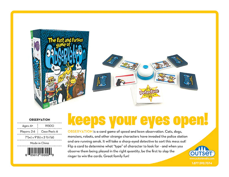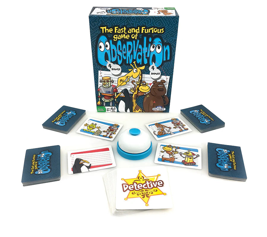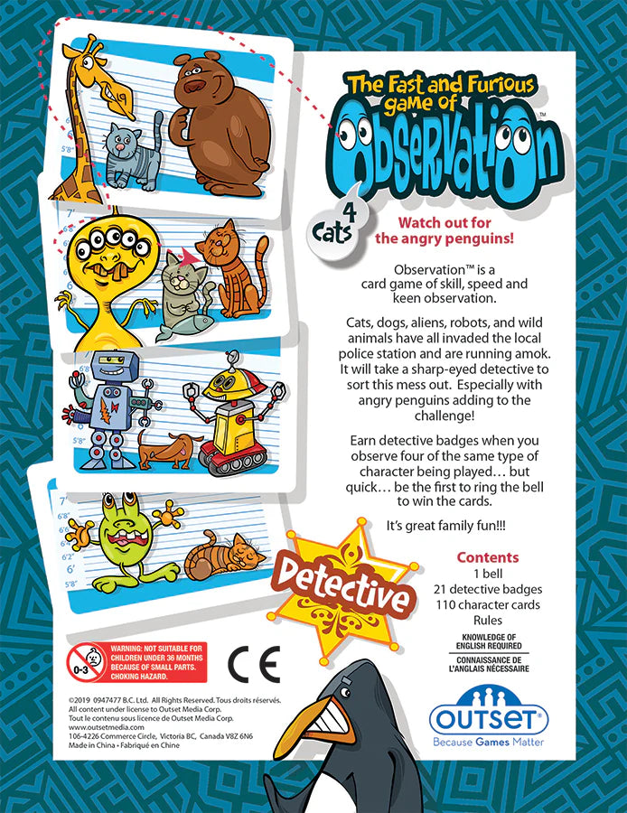 Observation is a card game of speed and keen observation. Cats, dogs, wild animals, aliens, and robots have invaded the police station and are running amok. It will take a sharp-eyed detective to sort this mess out! Find four characters from the same collection faster than your friends or family and then ring the bell! You'll earn a detective badge and collect the cards. But be careful of those pesky penguins, you can count on them to mess up your collection! It's great family fun!!!