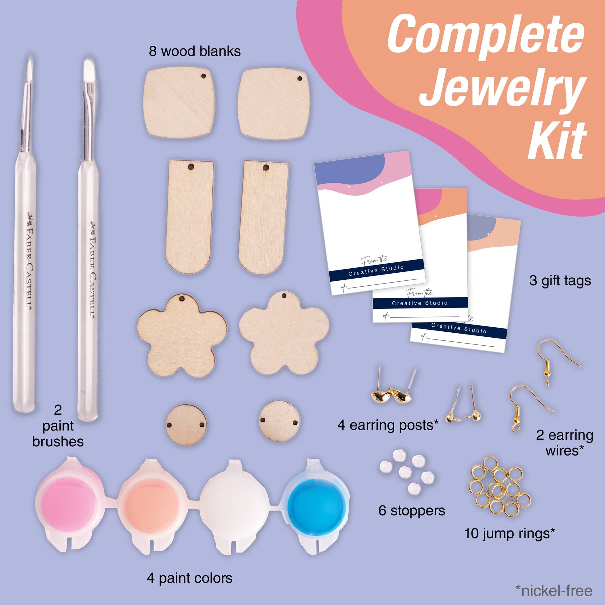 Contents Include: 8 Wood blanks, 4 Colors of acrylic paint Pink, Peach, White and Blue, 2 Paintbrushes Medium flat and Fine point, 1 Pair of small earring posts, 1 Pair of large earring posts, 1 Pair of wire earring hooks, 10 Jump rings, Clear earring backs, 3 Customizable gift tags and Instructions