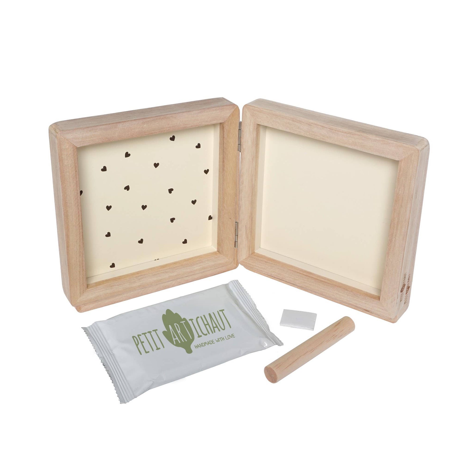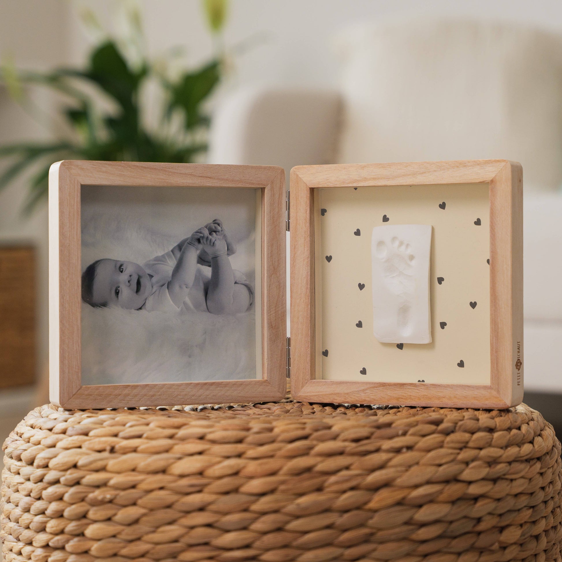 The Double Frame - Pretty Hearts offers a unique way to display both a photo and a baby imprint. This 2-panel standing frame combines a photo on one side with a imprint on the other. Choose your favorite design by using the reversible beige background with or without heart patterns. The kit includes hypoallergenic clay, a roller, and instructions to easily create the imprint.