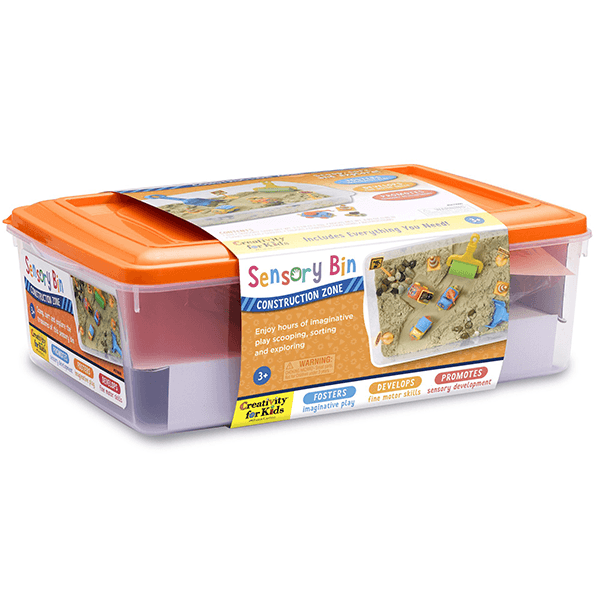 Go on a building adventure while engaging your sense of touch with a construction zone themed sensory bin! Play with sensory sand, rocks and trucks to build fine motor skills and promote sensory development. Parents and children can enjoy hours of imaginative play together! Complete cognitive tasks found in the illustrated instructions like “Name each construction item” to encourage thought, perception and knowledge in your child. Place your self-contained bin on a towel to prevent mess while you are scooping, digging and playing with the included sensory materials! Hands-on play is a great way to prepare your child for preschool! While on a construction site adventure your children will learn to explore, create and engage. All materials inside Creativity for Kids Sensory Bins are kid-friendly and safety tested.
