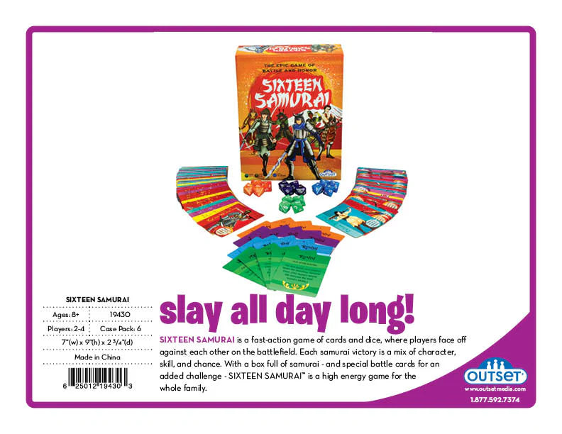 Sixteen Samurai is a simple, but fast-paced game of honour and glory. In this game of cards and dice, players face-off against each other on the battlefield. Each battle consists of 16 samurai with various characteristics of power, speed, armor and karma. Each victory is a mix of a Samurai's characteristics and chance. With a box full of 70 Samurai, and special action cards for an added challenge, Sixteen Samurai is a game of glory with high energy fun for the whole family.
